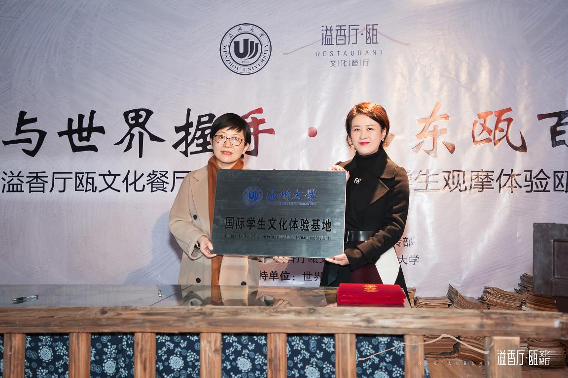 党总支书记林爱菊及两名国际学生代表共同为瓯味十碗揭开“红盖头”,林爱菊书记还与溢香厅瓯文化餐厅负责人共同签署协议,向对方授“温州大学国际学生文化体验基地”牌,未来这里将成为我校国际学生温州文化体验基地之一,双方将就温州传统文化传播开展深入合作,为国际学生们提供更丰富的温州文化体验。