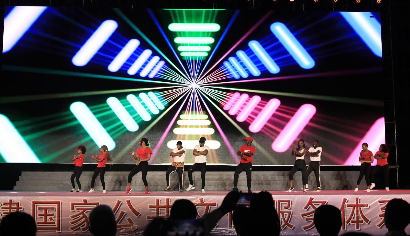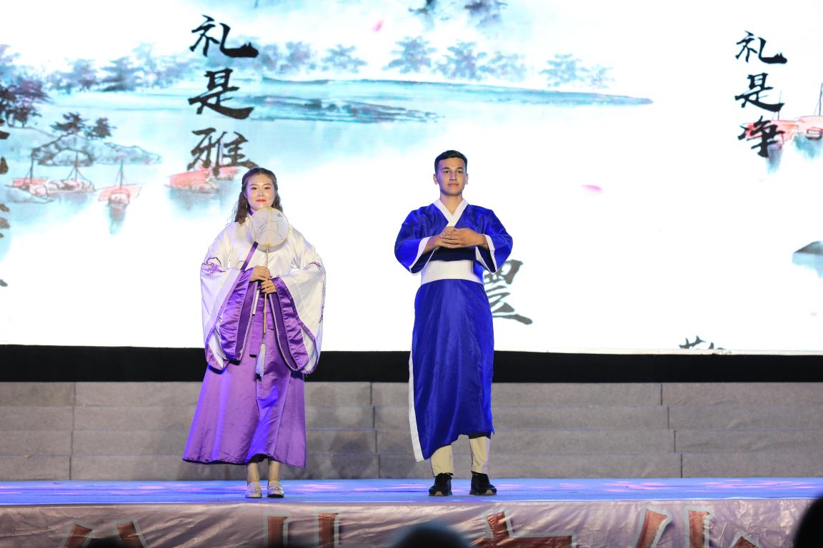 晚会现场,20多名国际学生身穿中国传统汉服演绎“礼乐诗书”汉服表演,他们的动作优雅端庄,配合默契,展示了中国传统文化的独特魅力和时代风采。来自塔吉克斯坦的AMIROV RUSTAM等人上台展示了中国武术、传统剪纸及书法技艺,以特殊的方式表达对中国传统文化的喜爱和对新中国成立70周年的深深祝福。来自尼日利亚、津巴布韦、坦桑尼亚等国的国际学生们上演一场活力十足的非洲舞蹈秀,他们的舞蹈经过精心编排,洋溢着青春活力,配合异域特色的非洲音乐,将非洲舞蹈演绎得精彩纷呈。来自安哥拉的生物技术专业学生TAVIRA JENIFFER PRISCILA DA CUNHA以一首葡萄牙语歌曲《Abandonada Por Você》赢得在场观众的热烈掌声,随后她以中文合唱《我爱你,中国》结尾,献礼新中国成立七十周年。