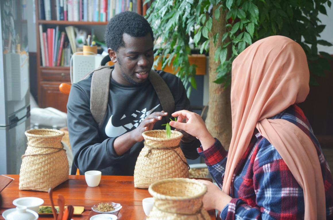 中国是茶的故乡,中国茶文化有故事、有声音、有味道、有思想,在“一带一路”上承担着重要角色。大国外交策略也时刻能看到中国茶的身影。以茶为专题针对国际学生进行国情教育,既是文化传播的有效形式,也更加有针对性和延展性,符合国家战略的要求。随着音乐学院的何铮同学用钢琴演奏出脍炙人口的中国民歌《茉莉花》,汉服装扮的茶艺师们开始冲泡茉莉花茶,在芬芳馥郁的茉莉茶香中,阚老师导入课程,逐步用英文讲解中国茶的历史、种类及加工等相关茶知识。红茶、绿茶,一杯杯中国最具代表性的名茶齿颊留香,回甘悠长,令国际学生赞不绝口。