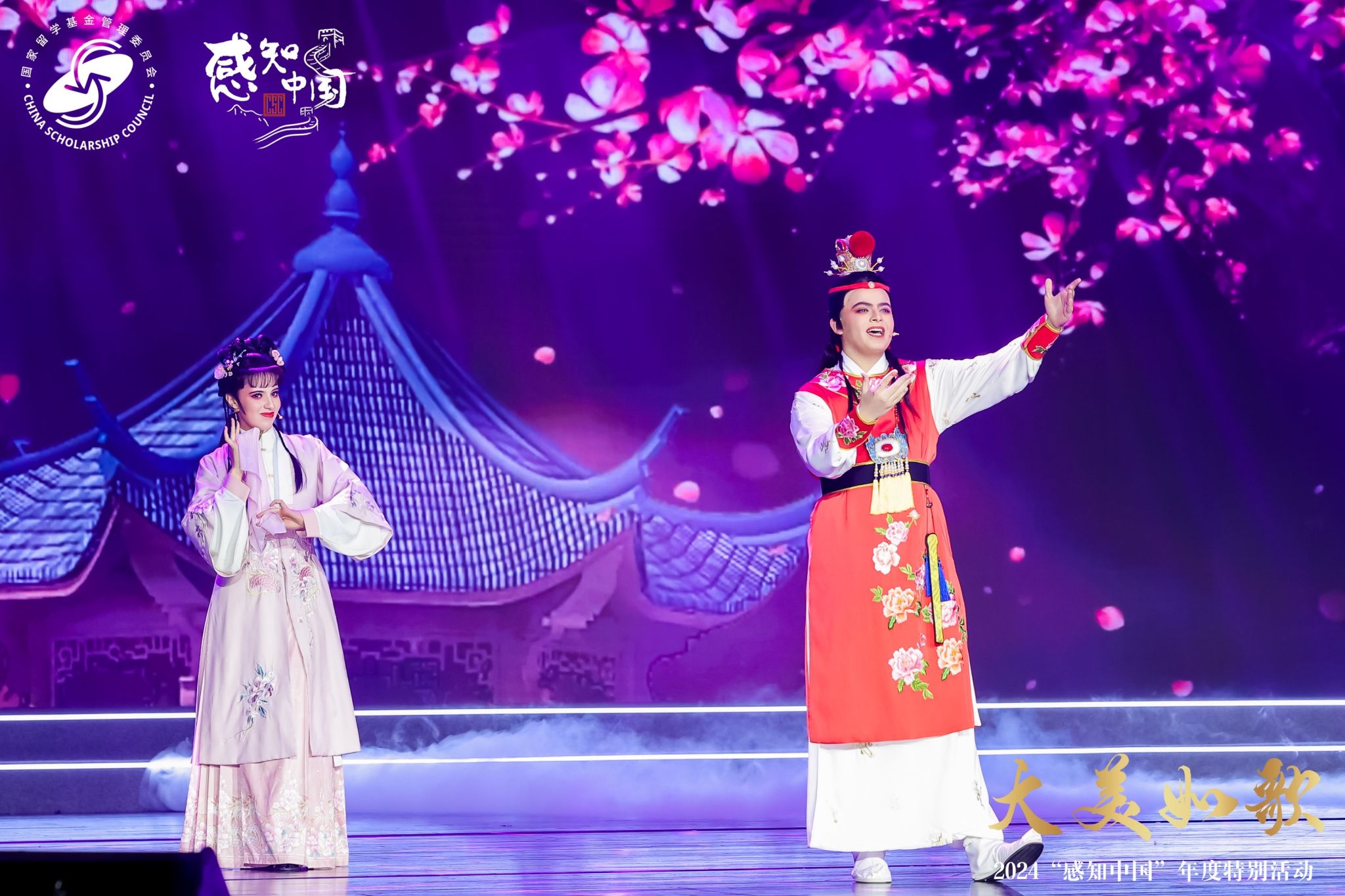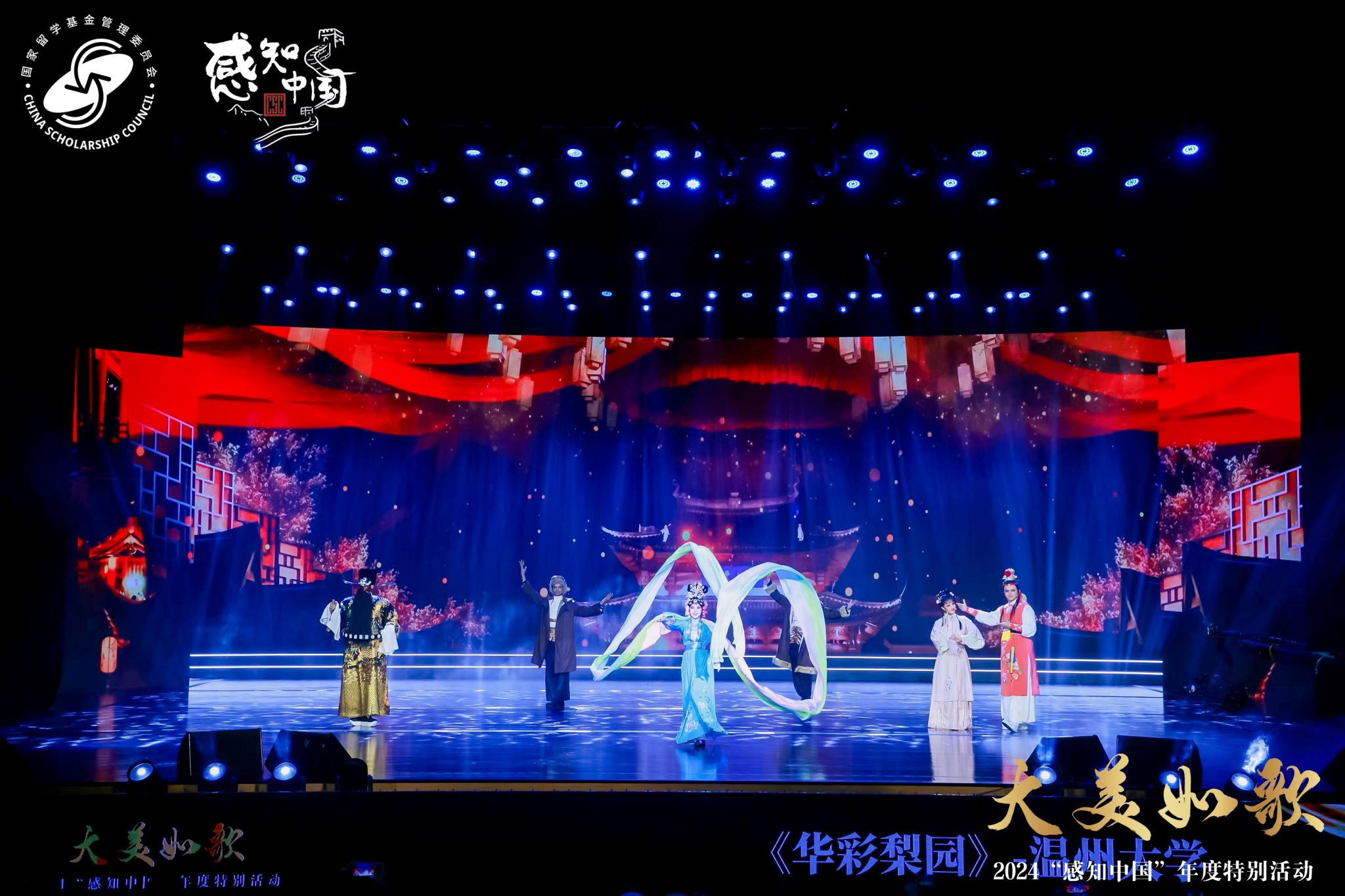 12 月 12 日晚,由教育部国家留学基金管理委员会主办的“大美如歌—2024‘感知中国’年度特别活动”于上海华东师范大学盛大开幕。温州大学留学生戏曲节目《华彩梨园》经多轮遴选,脱颖而出,受邀参演,全国仅有北大、清华、复旦等 13 所高校获此殊荣。温州大学留学生们循“戏从温州来”的千年传承,将中华优秀传统艺术精彩演绎,收获如雷掌声与满堂喝彩,尽显温大学子非凡风采。