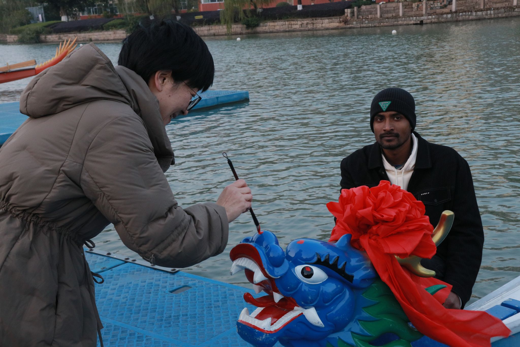 党总支书记林爱菊为龙头“点睛”。落笔之处,龙睛炯炯,寓意着龙舟队奋勇前行、势不可挡。随后,温州大学国际龙舟队为大家呈现了一场精彩的龙舟表演,队员们整齐划一的划桨动作,如蛟龙出水,气势磅礴。他们喊着响亮的口号,伴随着激昂的鼓点,在水面上疾驰而过,溅起的水花似是他们激情的绽放,充分展现了前期训练的成果与团队的高度默契,也让在场的师生们提前领略到了国际龙舟队的风采与实力。