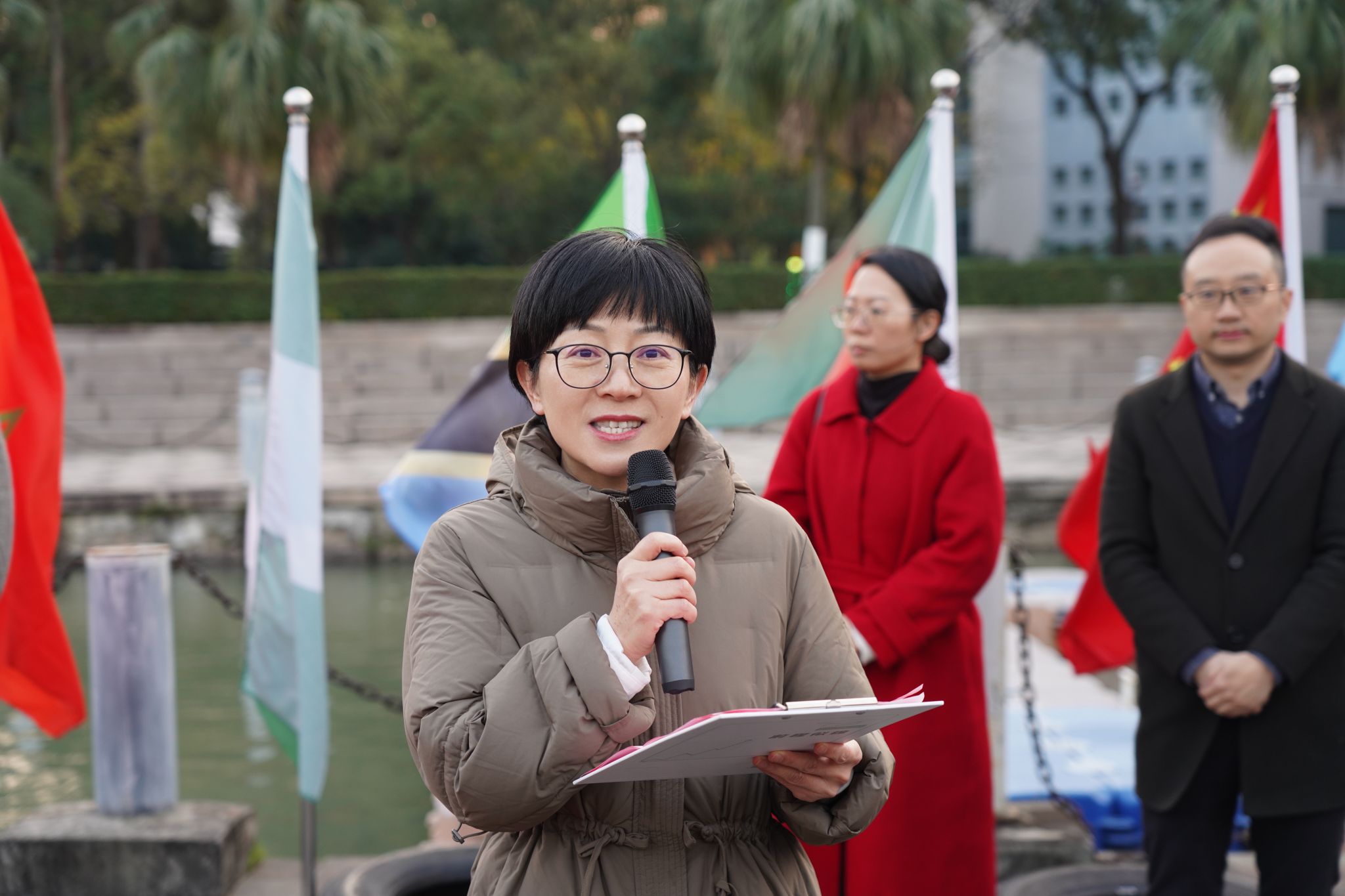 温州大学体育与健康学院副书记李丽为国际龙舟队队长罗文达授旗。“划龙舟是一项非常有趣的活动,作为国际龙舟队的队长,我一定会肩负起这个责任,带领队员们认真训练,让每一次划桨都充满力量与激情,让更多人领略到中华龙舟文化的独特魅力”,来自越南的留学生罗文达接过手中的旗帜,激动地说道。