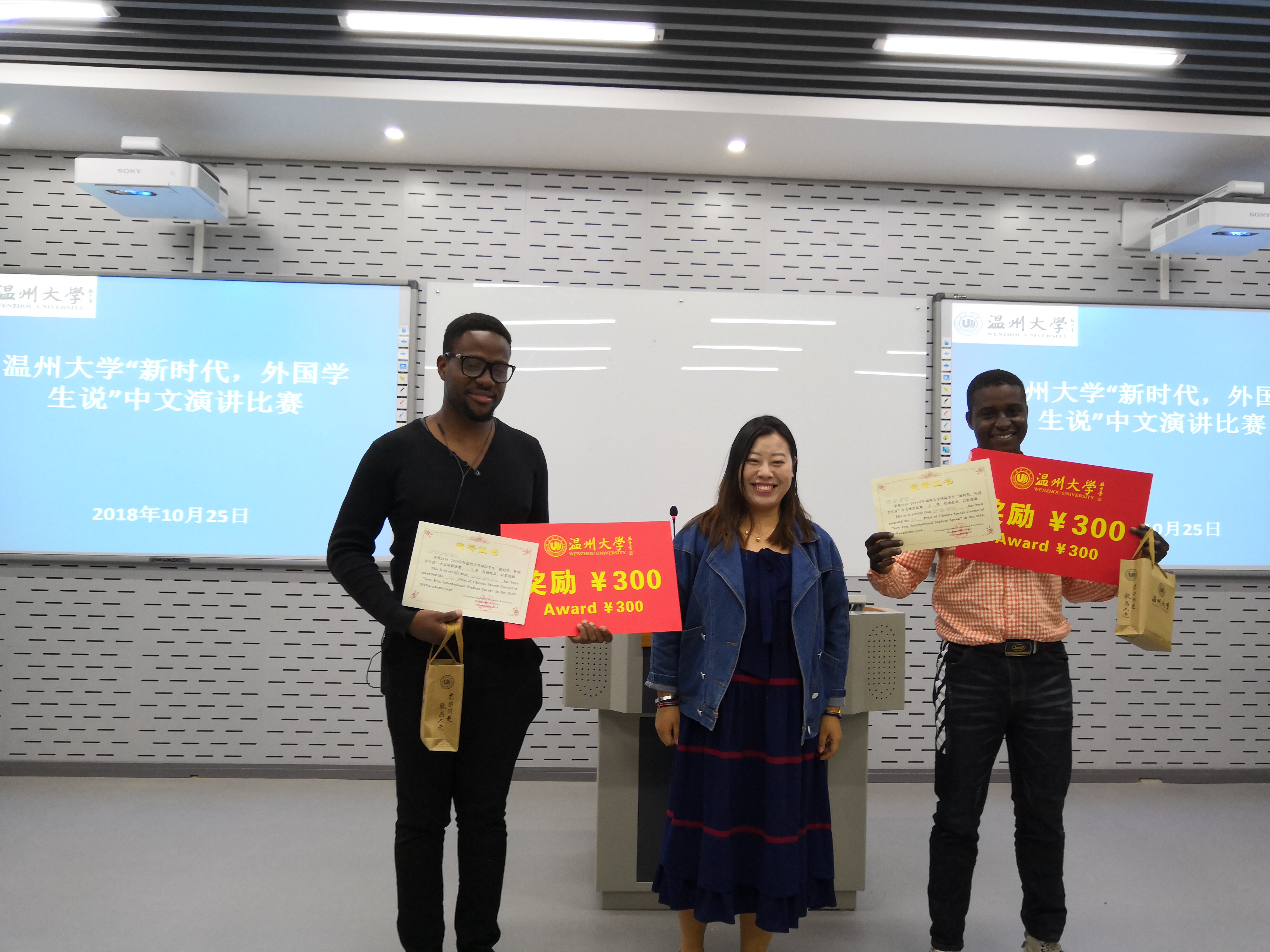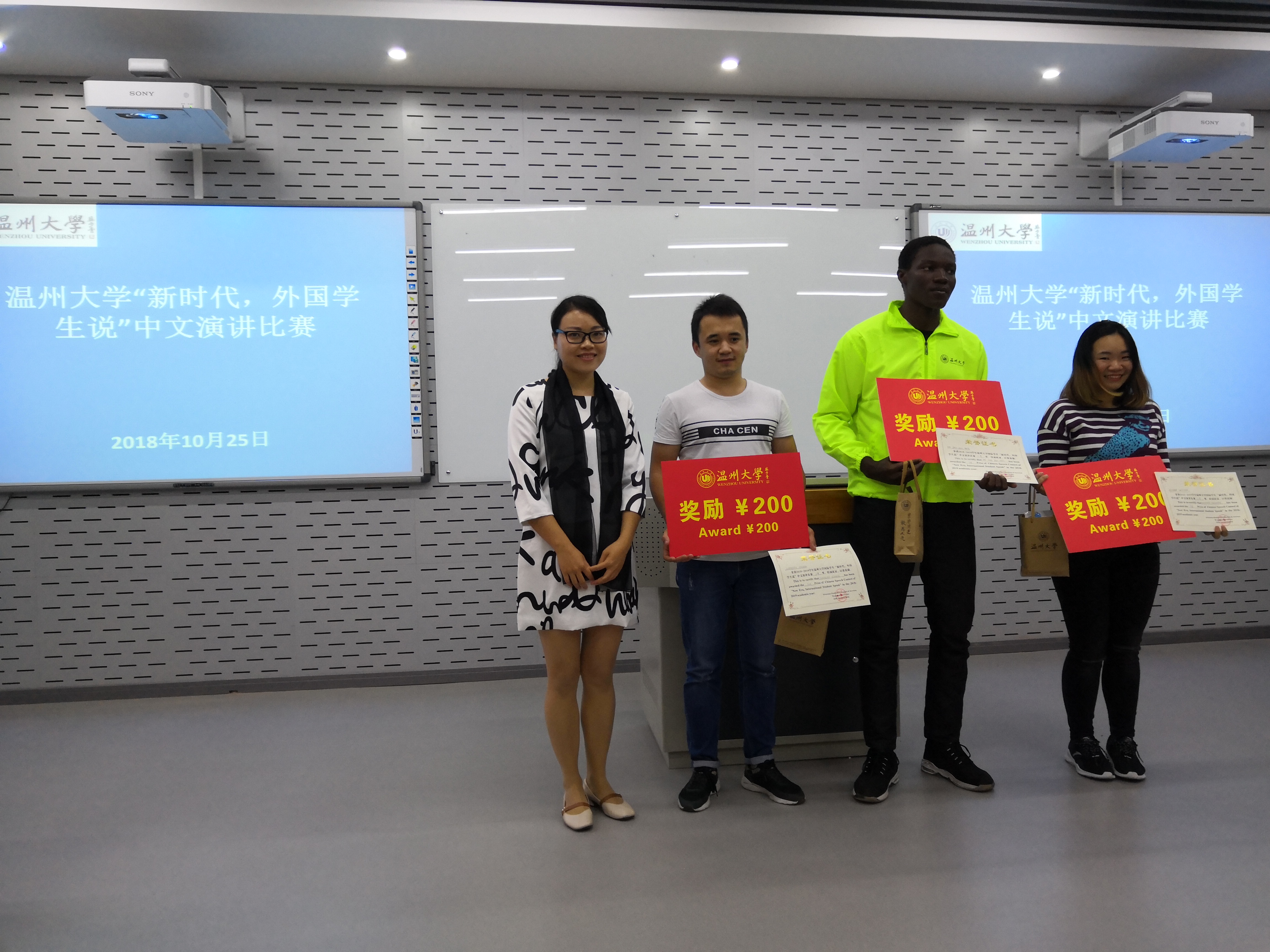 演讲比赛以“新时代”为主题,展示国际学生对中国、浙江高端技术制造能力、现代新农业技术、中国传统民俗文化等方面的独特看法,国际学生们一一上台讲述自己的亲身经历。来自乌兹别克斯坦的MAMASOBIROV MIFTOKHIDDIN以在温州大学过中秋节为切入点,对比了自己国家的传统节日与中国传统节日,他说在学校吃月饼过中秋节是非常温暖的一件事,让他体会到家的感觉。来自加纳的王汉别出心裁,以一个“来自加纳的小伙子的故事”为主题,向在场师生分享了自己在中国学习、生活的有趣经历,他的演讲诙谐幽默、语言流畅,赢得阵阵掌声。来自塞拉利昂的JENG ABU BAKARR谈到他眼中的中国时说道,中国的科技发展、快捷支付方式、畅通的交通网络和便利的出行方式都让这里的生活变得非常舒适,他期待今后能在中国继续深造,走进更多城市,感受这里的一切。活动最后,评委老师分别为获得一、二、三等奖的学生颁奖。