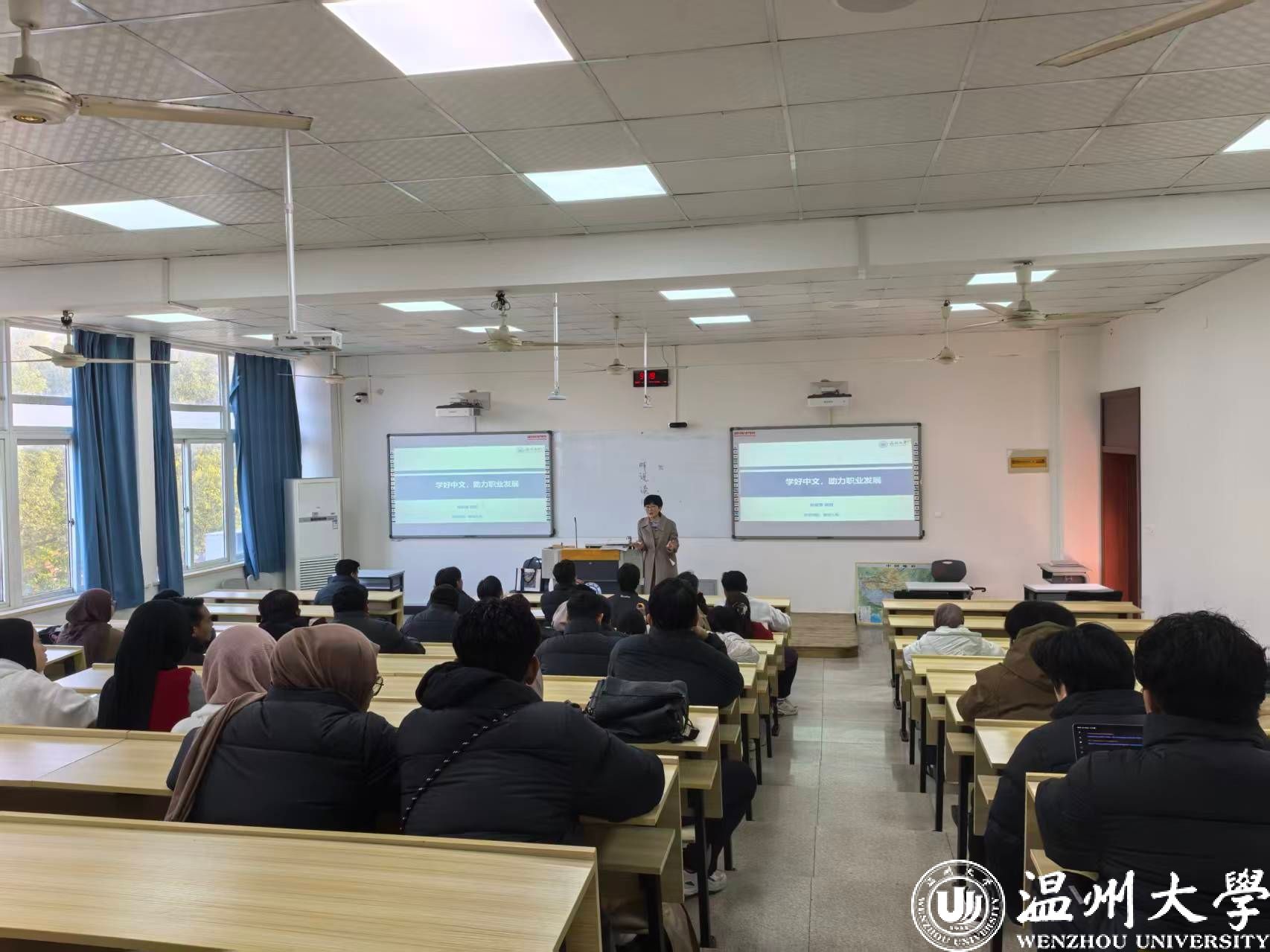 为青山班学员举办“学好中文,助力职业发展”专题讲座。本次讲座由林爱菊教授主讲,聚焦汉语学习与职业发展的核心关联,为学子们明确学习方向、夯实职场基础。