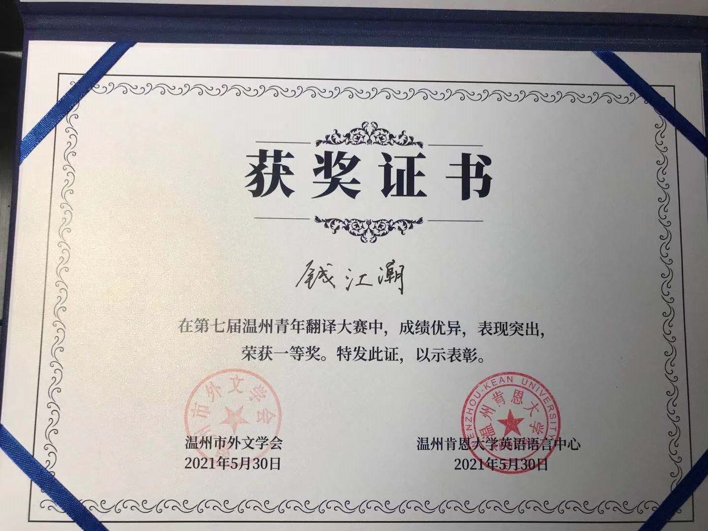 留学生辅导员老师钱江潮在决赛中最后一组上场,凭借娴熟的口译技能,最后荣获一等奖。本次青年翻译大赛分为初赛、复赛、决赛。全温州市约有200名来自各行各业的选手参加,既有大学生,也有来自温州市各高校的英语教师,能获得一等奖实属不易。