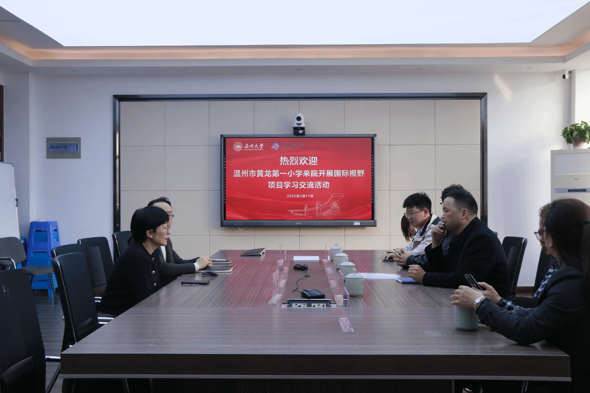 的发展历史、国际化特色及近年来留学生文化交流、社会实践方面的创新举措,重点分享了留学生参与市内同类学校国际化建设的情况。陈利汉校长介绍了黄龙第一小学的校园概况与国际化建设目标,他期待留学生的参与为学校带去浓浓的国际化氛围,也希望双方共同探索跨学段实践资源共享新模式。